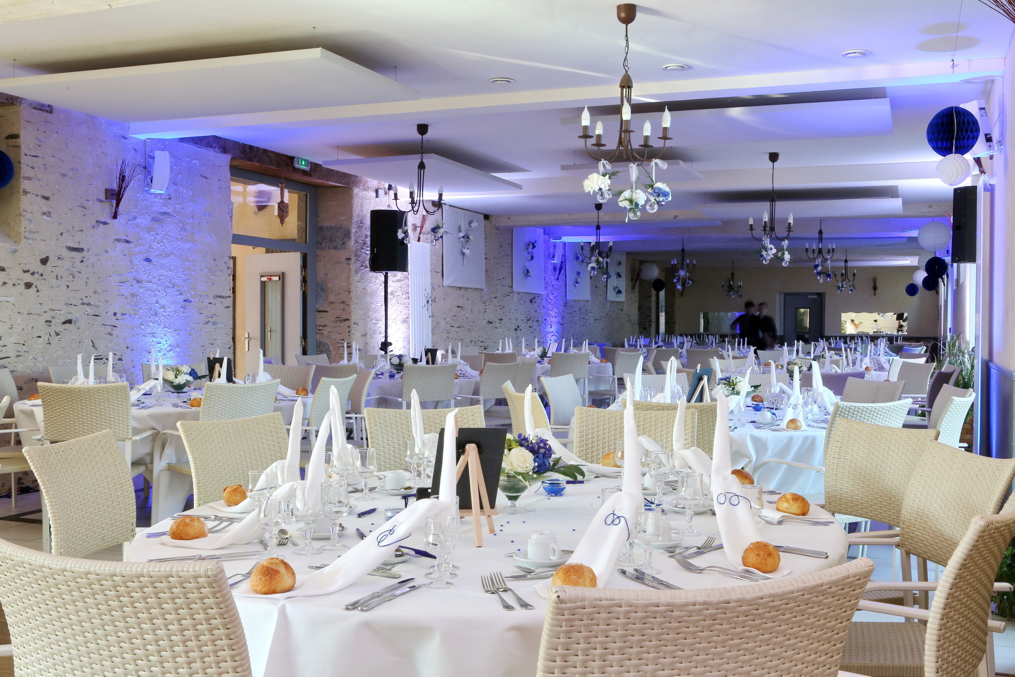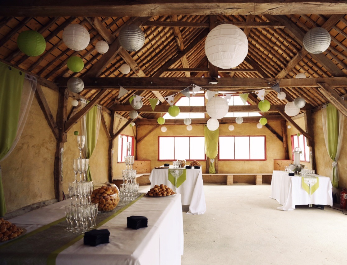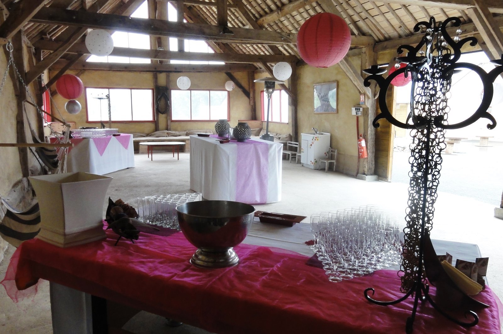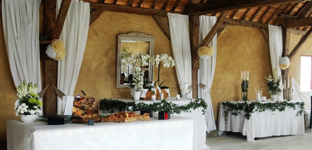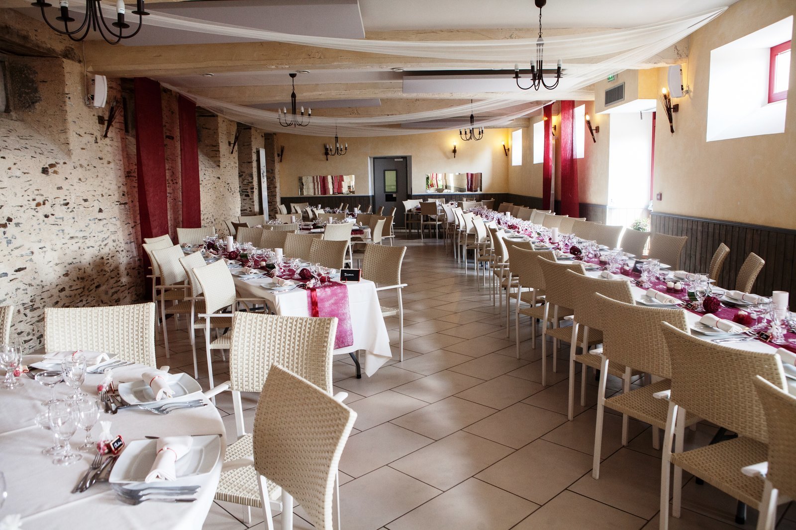 Aménagée dans une ancienne longère, la salle de réception a conservé le charme des poutres et des murs en pierres apparentes.