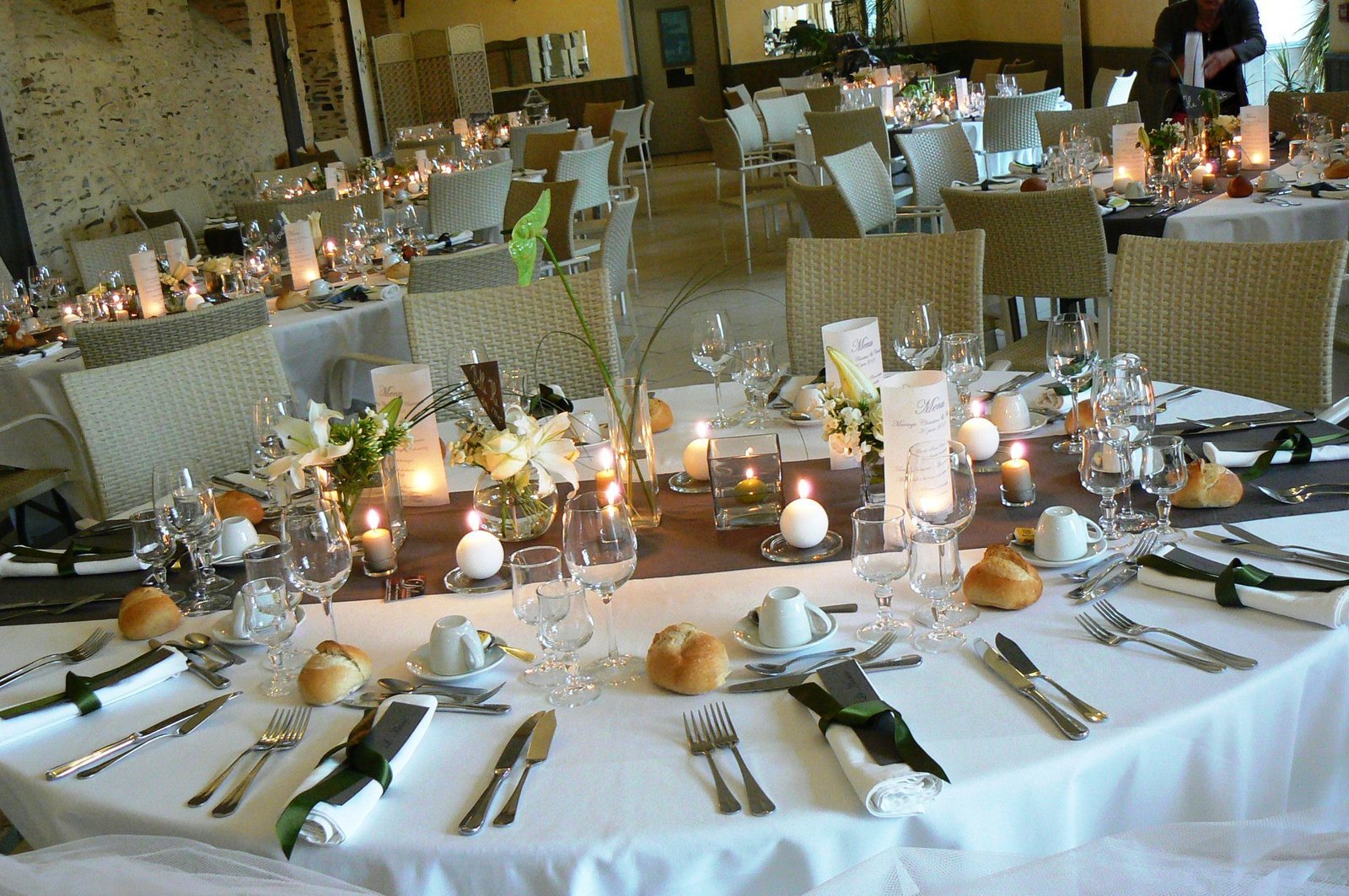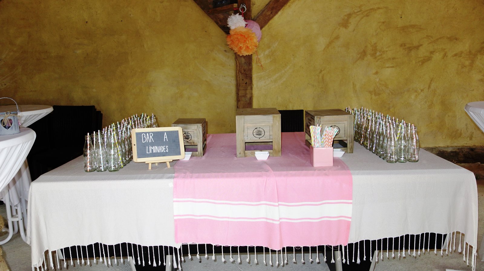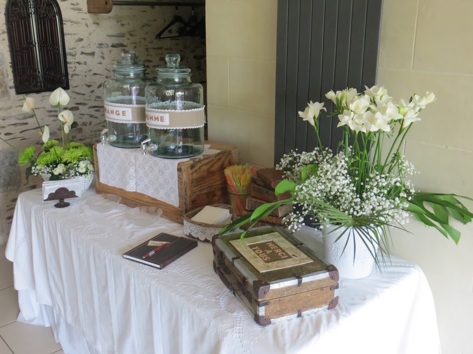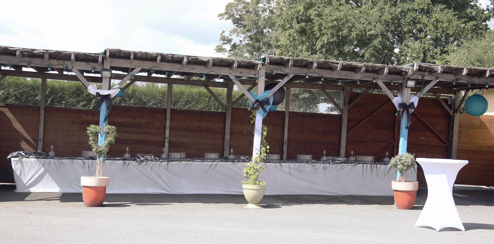 Aménagée dans une ancienne longère, la salle de réception a conservé le charme des poutres et des murs en pierres apparentes.
